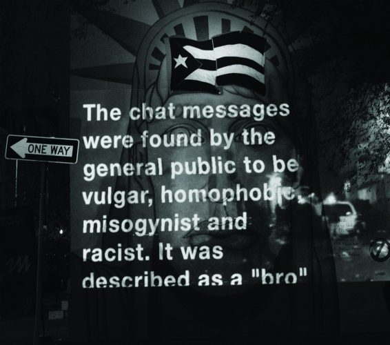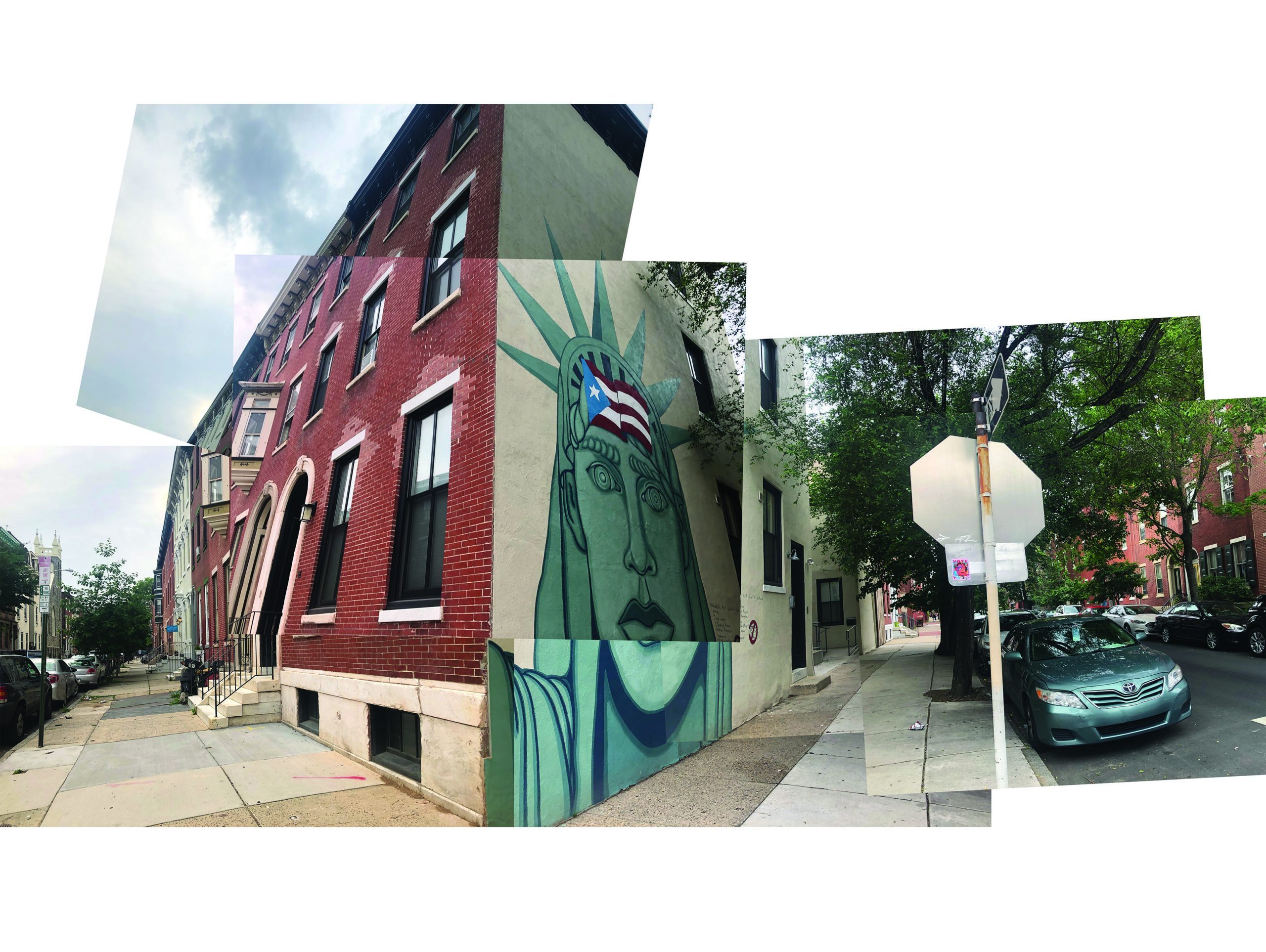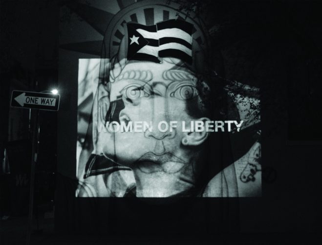 Women of Liberty is a site-specific intervention of the mural at N 17th St and Mt Vernon St corner in Philadelphia. The week-long activation at the Mural location in November 2019 included a temporary revision of the flag and a series of projections.The mural captures the moment when a group of people hung the Puerto Rican flag on the Statue of Liberty in demand of independence for the island. By projecting faces of women onto the Statue of Liberty’s mural face the intervention explores similarities in the fight against Puerto Rico’s colonialism and the fight for women’s rights.